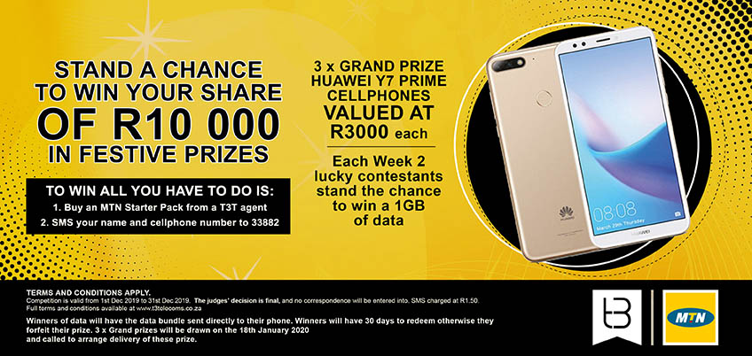 - Subscribers who buy an MTN Starter Pack for any value amount from a T3T agent between 1st Dec 2019 and 31st Dec 2019 stand a chance to win one of 3 x Huawei Y7 Smart Phones valued at R3000 each or one of 8 x 1gig data bundles valued at R149 each.